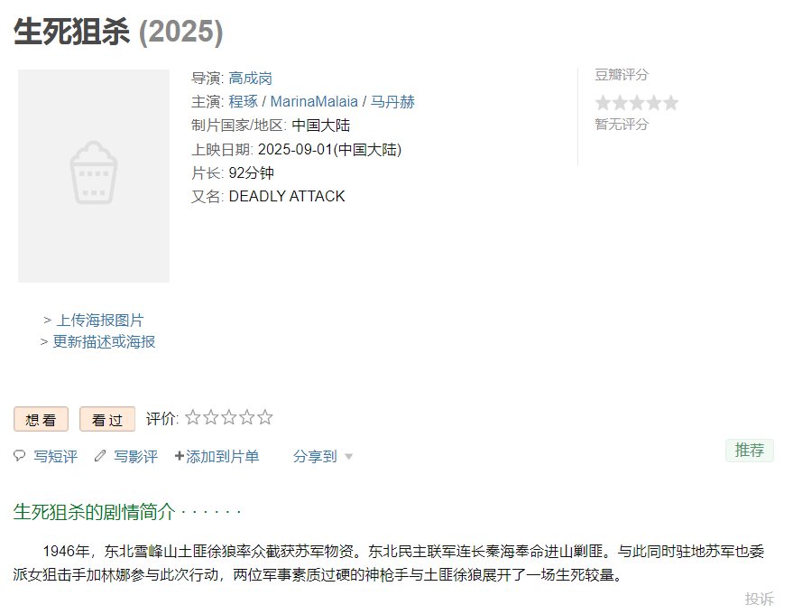 《生死狙杀》是由高成岗导演执导,程琢和马丹赫等联合主演,讲述了1946年,东北雪峰山土匪徐狼率众截获苏军物资。东北民主联军连长秦海奉命进山剿匪。与此同时驻地苏军也委派女狙击手加林娜参与此次行动,两位军事素质过硬的神枪手与土匪徐狼展开了一场生死较量的故事。