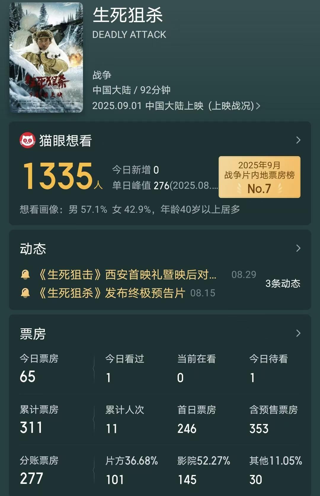 可《生死狙杀》的票房表现却远不尽人意,该片于9月1日上映,到现在两天时间,票房却只有311元人民币,没错是元没有万。